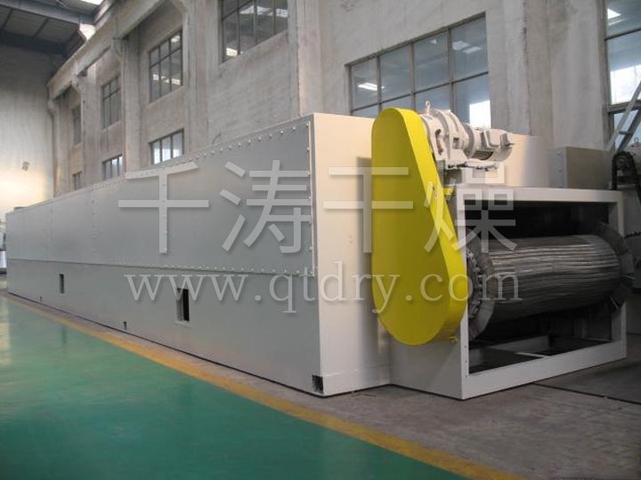 整個(gè)生產(chǎn)線為全封閉型(對(duì)物料而言),由擺動(dòng)布料段、干燥段、出料段三部分組成。擺動(dòng)布料段作用使海藻均勻分散在網(wǎng)板上,并且勻速輸送到干燥段,海藻經(jīng)過(guò)80℃熱風(fēng)干燥段,90℃熱風(fēng)干燥段和120℃熱風(fēng)干燥段后,再經(jīng)過(guò)出料段排料。循環(huán)風(fēng)向及各單元內(nèi)風(fēng)的循環(huán)為向下式,即加熱后的空氣由引風(fēng)機(jī)吸入,在風(fēng)機(jī)出風(fēng)口首先預(yù)分布再經(jīng)過(guò)孔板均風(fēng)后,熱風(fēng)從物料的下面向上(或從物料的上面向下)穿透物料層。